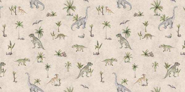 Un motivo avventuroso pieno di dinosauri, come il T-Rex e lo stegosauro, tra piante e paesaggi preistorici. Lo sfondo chiaro e le illustrazioni morbide creano un'atmosfera giocosa e nostalgica, perfetta per aggiungere un tocco fantasioso a qualsiasi ambiente.