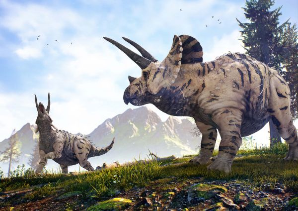 Dinosauri che camminano nella natura. Combina questa carta da parati fotografica nella stanza dei bambini e crea una vera stanza dei dinosauri.