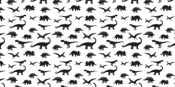 Carta da parati fotografica bianca con illustrazioni di vari dinosauri neri