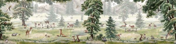 Nel prato aperto ricco di erba, circondato da pini e alberi decidui, i cervi vagano agili, conigli e ricci si nascondono tra i funghi, mentre tassi, volpi e scoiattoli si mescolano giocosamente nella scena della natura.