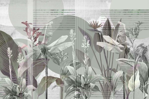 Una combinación armoniosa de hojas tropicales y formas geométricas abstractas en tonos apagados. Este diseño irradia una atmósfera moderna y relajante, perfecta para un interior sereno y contemporáneo.