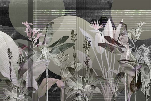 Una combinación armoniosa de hojas tropicales y formas geométricas abstractas en tonos apagados. Este diseño irradia una atmósfera moderna y relajante, perfecta para un interior sereno y contemporáneo.
