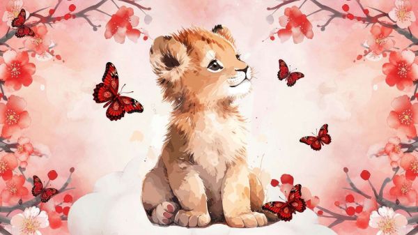 Un adorabile cucciolo di leone guarda sognante delle eleganti farfalle rosse che svolazzano intorno a lui. Circondato da rami fioriti e uno sfondo acquerellato caldo in morbidi toni di rosso e pesca, questo design emana giocosità ed eleganza.
