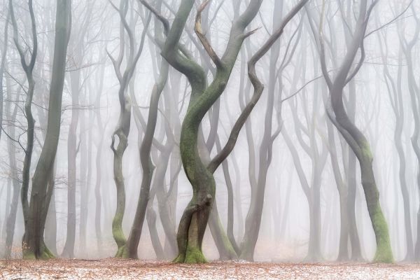 Una foresta nebbiosa e sognante con alberi contorti in autunno.