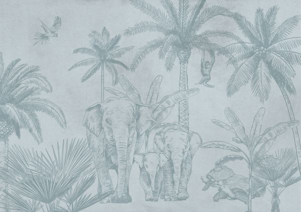 Famiglia di elefanti nella foresta con sentieri scrostati in blu. Utilizzate questo sfondo per un vero amante degli animali.
