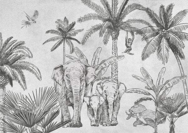 Elefanti e tartarughe nella foresta. Carta da parati trendy e alla moda. Questa carta da parati completa la stanza.
