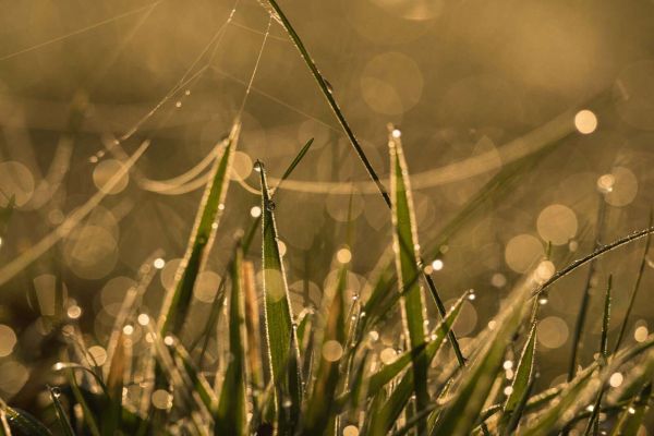 Gocce di rugiada delicate brillano come gioielli sulle foglie d'erba, mentre la morbida luce del mattino proietta un alone dorato sull'immagine. Ragnatele sottili catturano la luce e amplificano l'atmosfera da sogno.