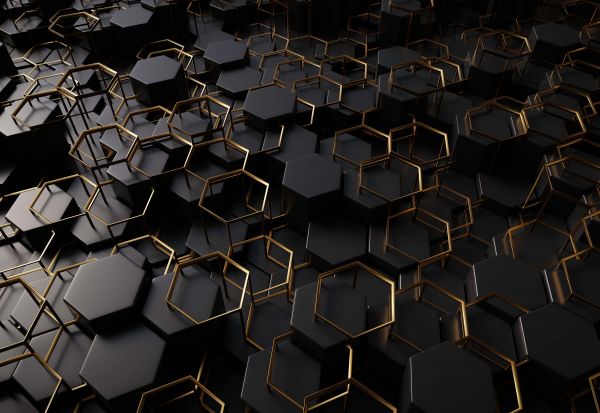 Graziosi esagoni neri con bordi dorati. Combinate questa carta da parati fotografica, per esempio, nella camera da letto per un'atmosfera ancora maggiore.