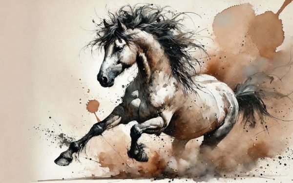 Questo impressionante design mostra un cavallo al galoppo in tutta la sua forza e magnificenza, catturato in uno stile acquerello dinamico. I morbidi toni della terra, come il marrone e il beige, sono completati da accenti scuri che enfatizzano i contorni dell'animale. La polvere sollevata e le sottili macchie di vernice rafforzano l'illusione di velocità e movimento, mentre le pennellate sciolte trasmettono un senso di libertà ed energia.