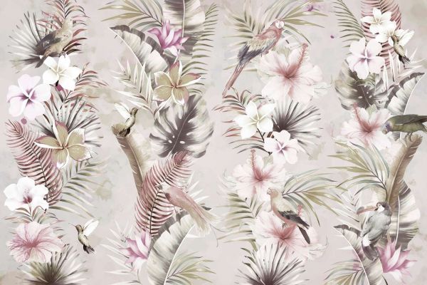 Una fusión exótica de flores vibrantes y hojas tropicales, con elegantes pájaros y colibríes que crean una atmósfera serena. Los suaves colores pastel realzan la sensación de tranquilidad y elegancia.