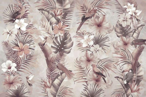 Una fusión exótica de flores vibrantes y hojas tropicales, con elegantes pájaros y colibríes que crean una atmósfera serena. Los suaves colores pastel realzan la sensación de tranquilidad y elegancia.