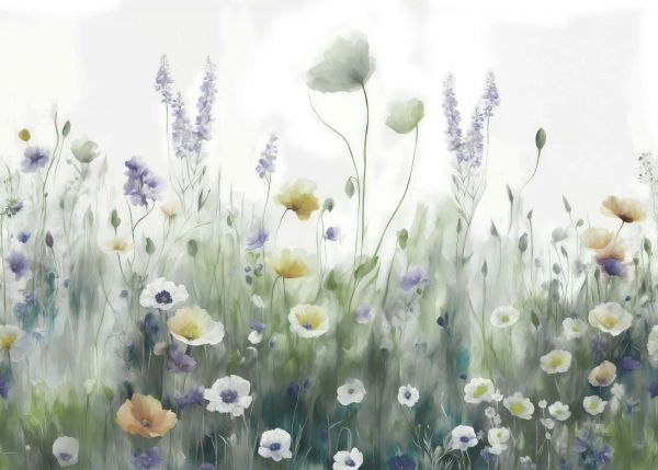 I toni blu freschi in questo design ad acquerello creano un'atmosfera calmante, come se ti trovassi in una fresca brezza primaverile. I fiori, in diverse sfumature, contrastano dolcemente con lo sfondo arioso.Questa palette di colori sottile ma scintillante è ideale per gli amanti di un aspetto leggero e naturale nei loro interni.