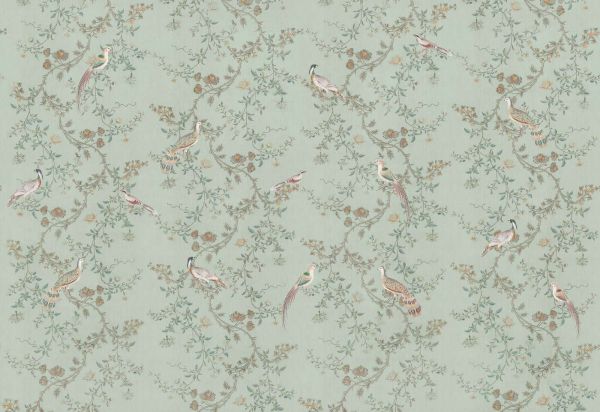 Elegante motivo di fagiani ornamentali riposanti su rami di fiori raffinati, incorniciati da uno sfondo verde chiaro con accenti naturali sottili in rosa antico, ocra e giada. Lo stile illustrativo conferisce all'insieme un'aria classica e raffinata con un carattere romantico, quasi fiabesco.