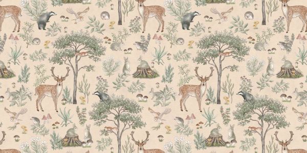 Un motivo magico di bosco con animali dettagliati come cervi, conigli, tassi e gufi, incorniciato da alberi, cespugli e funghi. Il colore di sfondo vintage crea un'atmosfera fiabesca e serena, ideale per aggiungere un accento incantevole in ogni stanza.