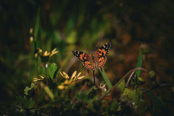 Questa scena incantevole mostra una farfalla arancione che si bilancia elegantemente su un sottile stelo di fiore, circondata da vegetazione selvatica. Le tonalità calde delle ali contrastano magnificamente con i verdi profondi e lo sfondo scuro. Il gioco di luce e ombra conferisce all’immagine un’atmosfera intima e quasi misteriosa.
