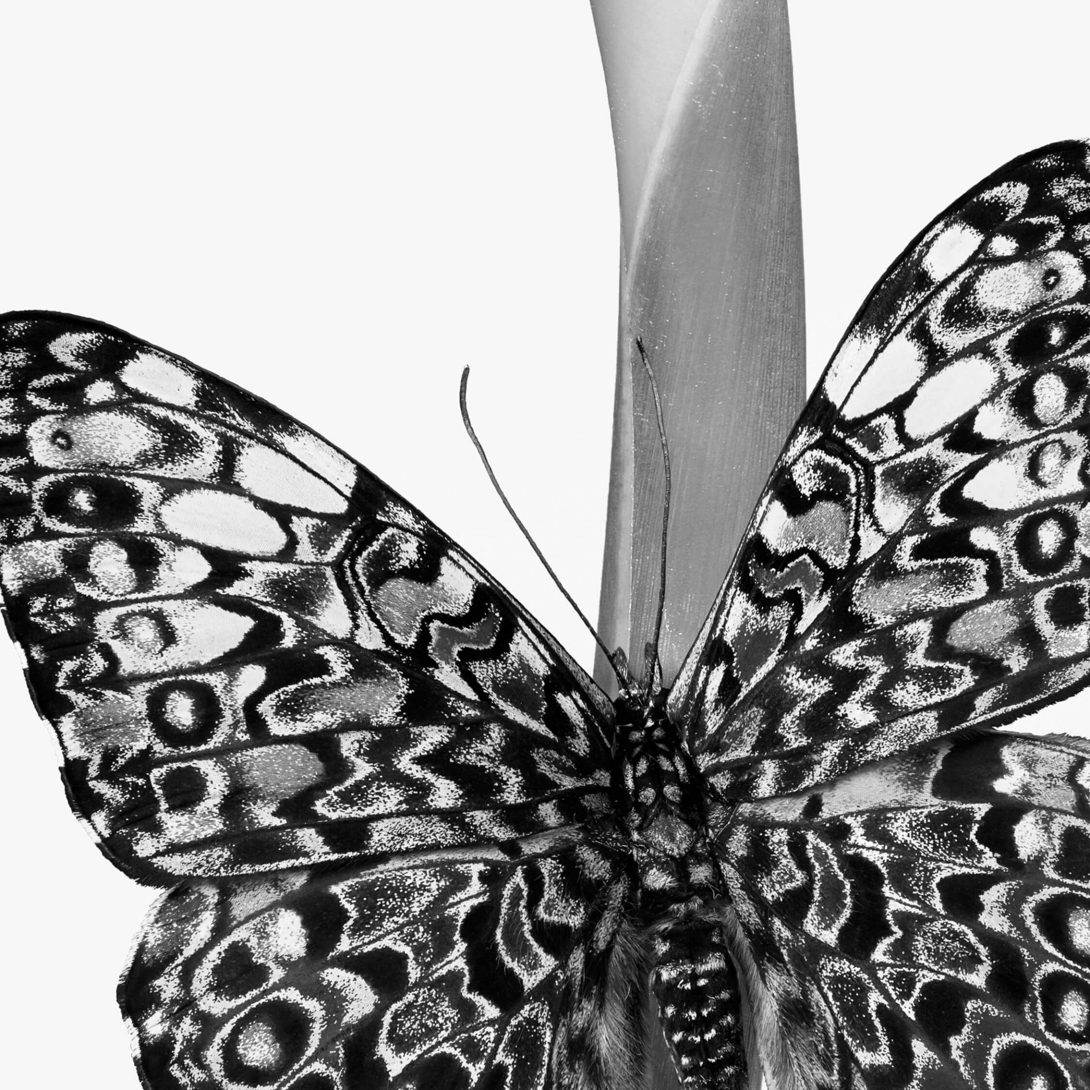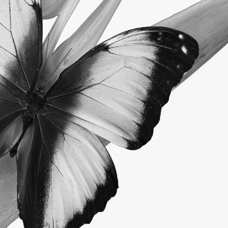 Bellissime farfalle tropicali su fiori di uccello del paradiso. Questa composizione in bianco e nero è ideale per dare una ventata di freschezza alla vostra camera da letto.