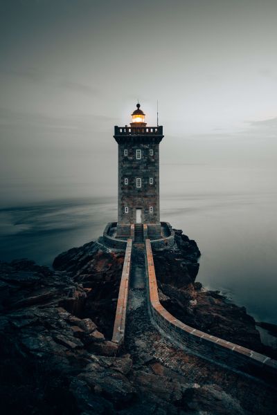 Un bellissimo faro in Bretagna. Il faro ha le luci accese.