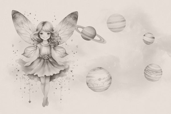 Un elfo sognante fluttua tra pianeti e nebulose stellari in tonalità di grigio morbide. La combinazione di spazio e fantasia conferisce al tutto un'atmosfera calma e magica.
