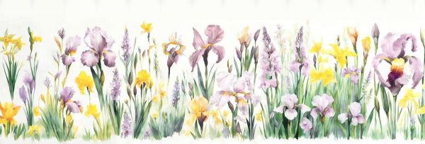 Una combinazione giocosa di iris colorati e fiori selvatici in vivaci tonalità acquerello. Le profonde sfumature di blu e gli accenti gialli solari danzano su uno sfondo chiaro, creando un aspetto arioso e fresco. Questo design emana gioia ed eleganza, perfetto per un interno luminoso e accogliente.
