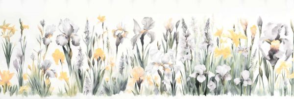 Un incantevole campo di fiori in tenui tonalità di blu, accentuato da sottili sfumature di giallo che creano un contrasto armonioso. La tecnica dell'acquerello conferisce un aspetto giocoso e leggero, portando un'atmosfera da sogno in ogni ambiente. Questo design è ideale per un interno rilassante e naturale.