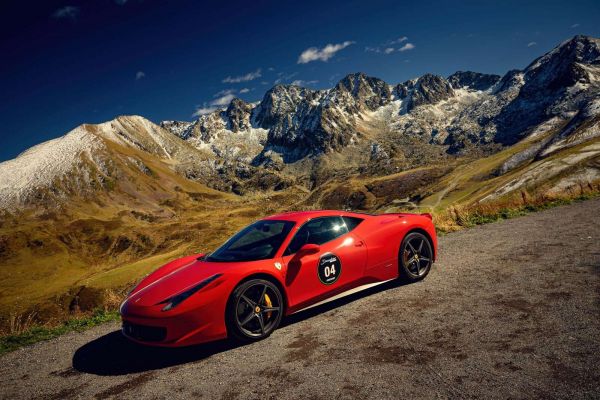 Una splendida Ferrari 458 Italia rossa è parcheggiata contro un paesaggio montano mozzafiato con cime innevate e pendii verdi. Il profondo cielo blu e l'ambiente aspro contrastano magnificamente con l'eleganza e la velocità di questa iconica auto sportiva italiana.