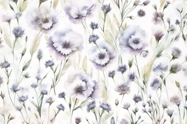 Un campo di fiori da sogno prende vita in questo raffinato design ad acquerello, dove delicati papaveri e fiori di cornflower in tenui tonalità lavanda contrastano sottilmente con foglie grigio-verdi. La tecnica dell'acquerello fluente conferisce all'insieme un aspetto leggero, quasi etereo, rendendo il motivo perfetto per un'atmosfera rilassante ed elegante in casa. Questo design si adatta perfettamente a stili d'interni romantici e classici, ma può anche ammorbidire un interno moderno con i suoi colori tenui e forme organiche. Combinalo con mobili in legno chiaro e accessori in tonalità pastello per un aspetto sereno o aggiungi accenti in ottone e crema per un tocco chic. I colori lavanda, lilla e grigio-verde portano un effetto calmante nello spazio e si adattano perfettamente a camere da letto, soggiorni o persino a uno spazio di lavoro elegante. La sottile tecnica ad acquerello crea una leggerezza giocosa, rendendo il design non opprimente e facile da abbinare a tonalità neutre come beige, bianco e grigio chiaro. Con questo design porti a casa la calma e l'eleganza di un campo fiorito, dando a ogni spazio un aspetto raffinato e sereno.