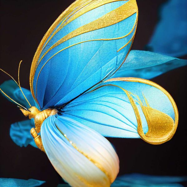 Una graziosa farfalla in blu brillante con accenti dorati spiega elegantemente le sue ali. I dettagli fini e la texture setosa conferiscono all'immagine un aspetto lussuoso e sognante.