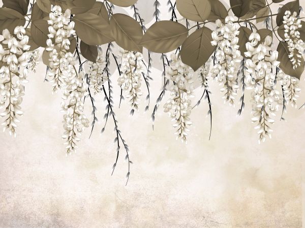 Fiori di acacia con sfondo beige. Con questa carta da parati fotografica nella vostra stanza, è come se aveste una siepe di fiori.