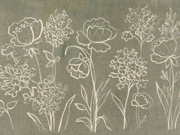 Questo design mostra un'interpretazione sottile e elegante dei fiori di campo, disegnati con una leggera linea bianca su un telaio verde muschio profondo e grigio. I fiori sono astratti ma riconoscibili: contorni più liberi di fiori, steli e foglie riempiono lo spazio senza eccessi. La struttura del fondo ha un carattere leggermente tessile, conferendo all'insieme un'atmosfera calda e naturale.