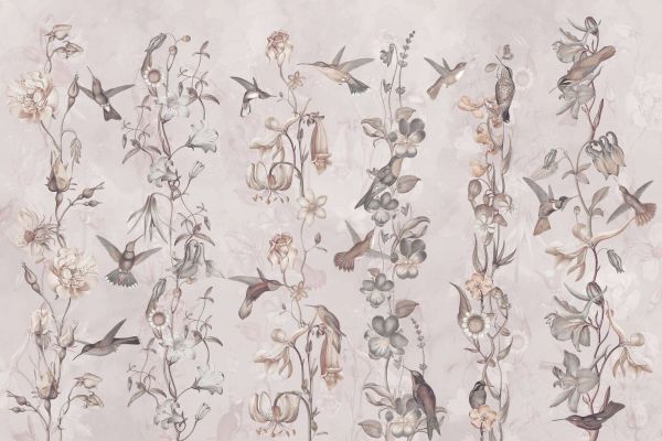 Un design romantico e raffinato con eleganti colibrì che svolazzano tra intricate trame di fiori. Le morbide tonalità di beige, taupe e grigio conferiscono un aspetto vintage, mentre sottili accenti di crema e marrone aggiungono calore. Questa scena armoniosa emana tranquillità ed eleganza, perfetta per uno spazio sognante e suggestivo.