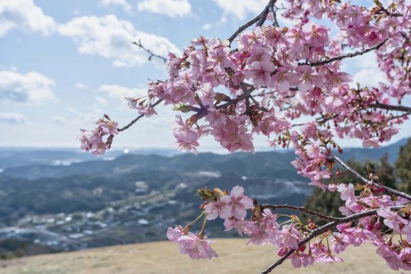 Un'immagine dettagliata di fiori giapponesi rosa con montagne sullo sfondo.