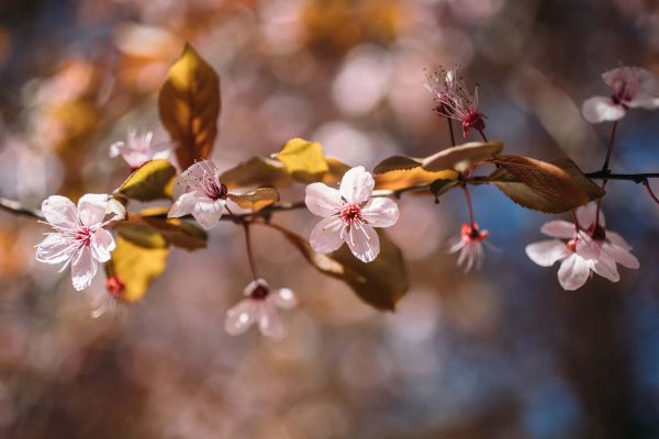 Un'immagine ravvicinata di un ramo di fiori rosa con foglie marroni.