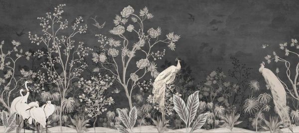 Questa rappresentazione artistica di uccelli bianchi e flora esotica su uno sfondo scuro esala tranquillità e mistero. Ideale per un arredamento moderno alla ricerca di un tocco di eleganza naturale.
