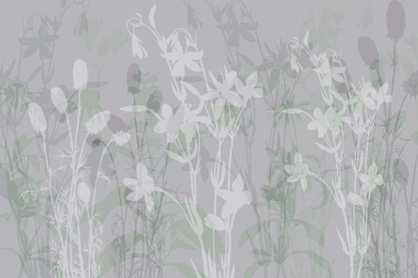 Un refinado juego de sombras florales transparentes en delicados tonos azules sobre un suave fondo gris verdoso. Las elegantes siluetas de flores silvestres crean una composición aireada y relajante que armoniza perfectamente con los entornos naturales.