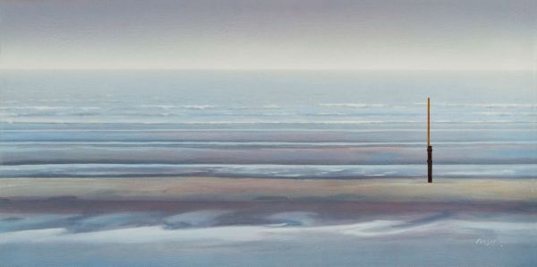 Una serena mare con colori tenui e linee sottili che evidenziano l'orizzonte, con un singolo palo di legno come elemento centrale.