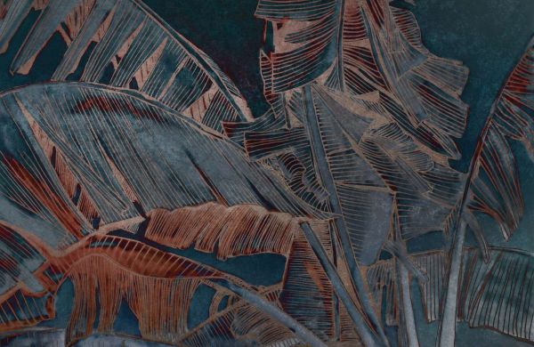 Un gioco di linee astratte di grandi foglie di banano in tonalità blu-verde profondo e ruggine ramata. Stratificato e potente con un aspetto lussuoso e tropicale.