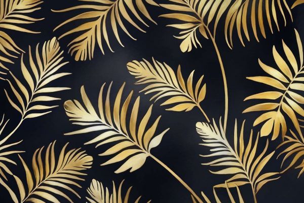 Un design lussureggiante con foglie di palma dorate su uno sfondo nero profondo. Le tonalità metalliche lussuose creano un'atmosfera elegante e tropicale, perfetta per un aspetto stiloso e chic. La combinazione del caldo oro e del contrasto scuro aggiunge un tocco raffinato ed esotico a ogni ambiente.