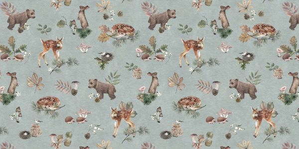 Un incantevole motivo boschivo con animali giocosi come cervi, orsi e conigli, circondato da foglie, funghi e altri dettagli del bosco. Questo delicato design su uno sfondo tranquillo porta la magia del bosco all'interno, ideale per creare un'atmosfera serena e naturale in ogni spazio.
