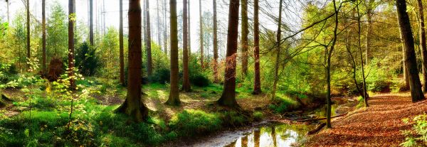 Panorama di una foresta autunnale con la luce del sole che brilla attraverso gli alberi.