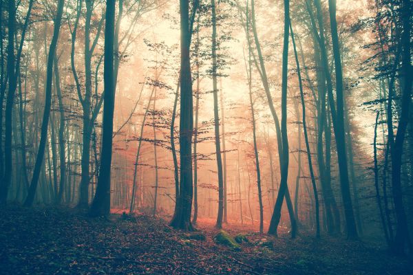 Una foresta piena di alberi alti dai mistici colori vintage.