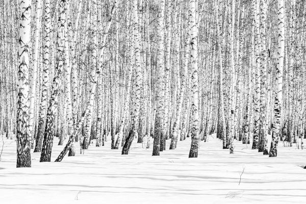 Una foto in bianco e nero di un paesaggio invernale in una foresta di betulle.