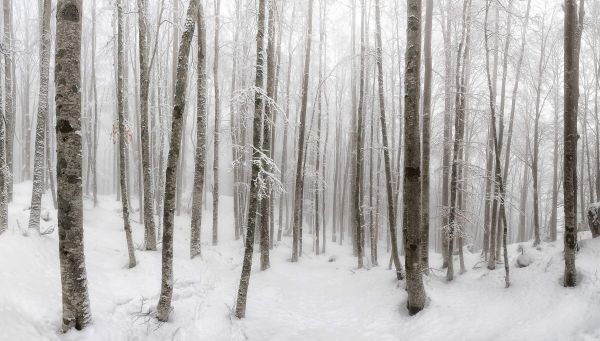 Una foresta di faggi coperta da uno spesso strato di neve.