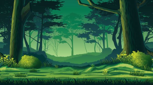 Un'illustrazione di una foresta verde e profonda piena di piante e alberi.