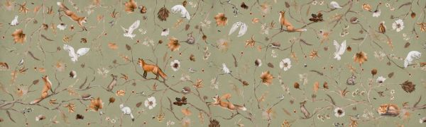 Questo caldo e giocoso tableau prende vita in un paesaggio boscoso vivace, con una ricca varietà di animali che si nascondono, riposano e giocano tra fiori eleganti e rami fogliosi. Le volpi saltano e si muovono furtive, le civette bianche volano leggermente sopra la composizione, mentre conigli, donnole, scoiattoli e uccellini canori sono sottilmente sparsi tra i fiori in toni marrone, ruggine e crema. Lo sfondo è di un verde oliva tenue che contrasta perfettamente con le tonalità calde del fogliame e trasmette al contempo calma e raffinatezza.