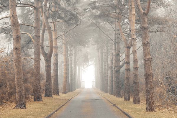 Foresta nella nebbia. Con questa carta da parati fotografica in casa, è come camminare lungo la strada.