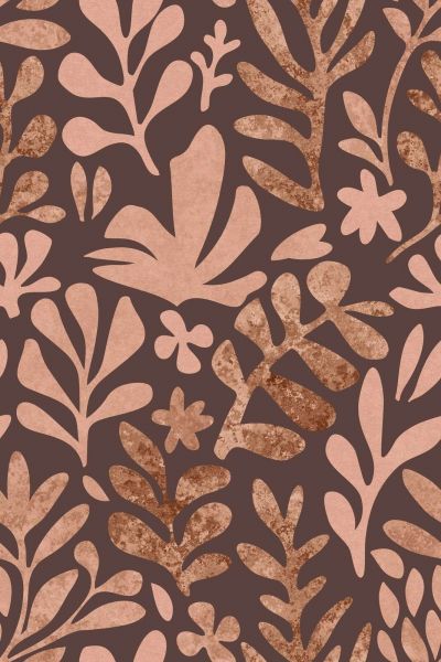 Questo design mostra un motivo botanico ripetuto di foglie stilizzate, rami e forme floreali. Le tonalità calde – che variano dal beige e dal sabbia fino al caramello – contrastano splendidamente con il ricco sfondo marrone scuro. Alcuni elementi presentano una leggera texture vissuta, che aggiunge ulteriore profondità e carattere. La combinazione di forme organiche e un forte contrasto cromatico crea un insieme giocoso ma equilibrato.