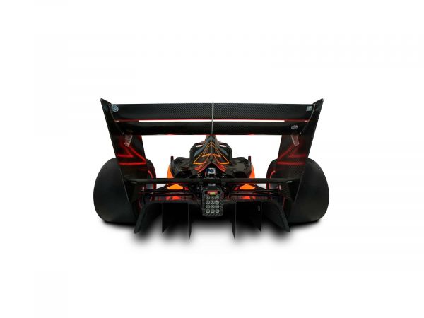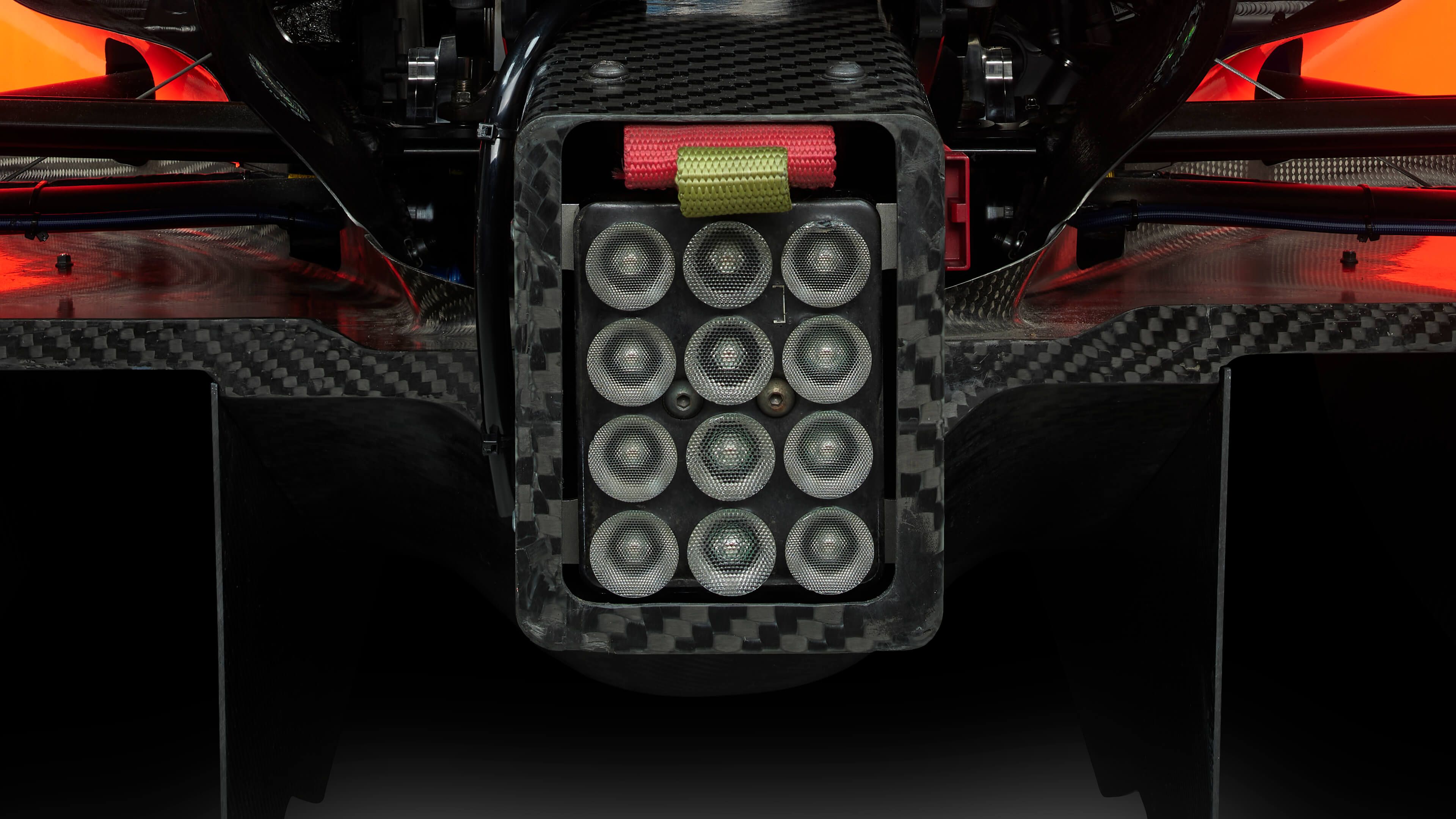 Posteriore di una vettura da corsa di Formula 3 con dettagli di alta qualità della luce della pioggia circondata da carbonio.