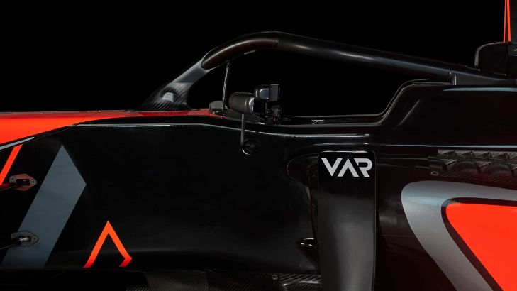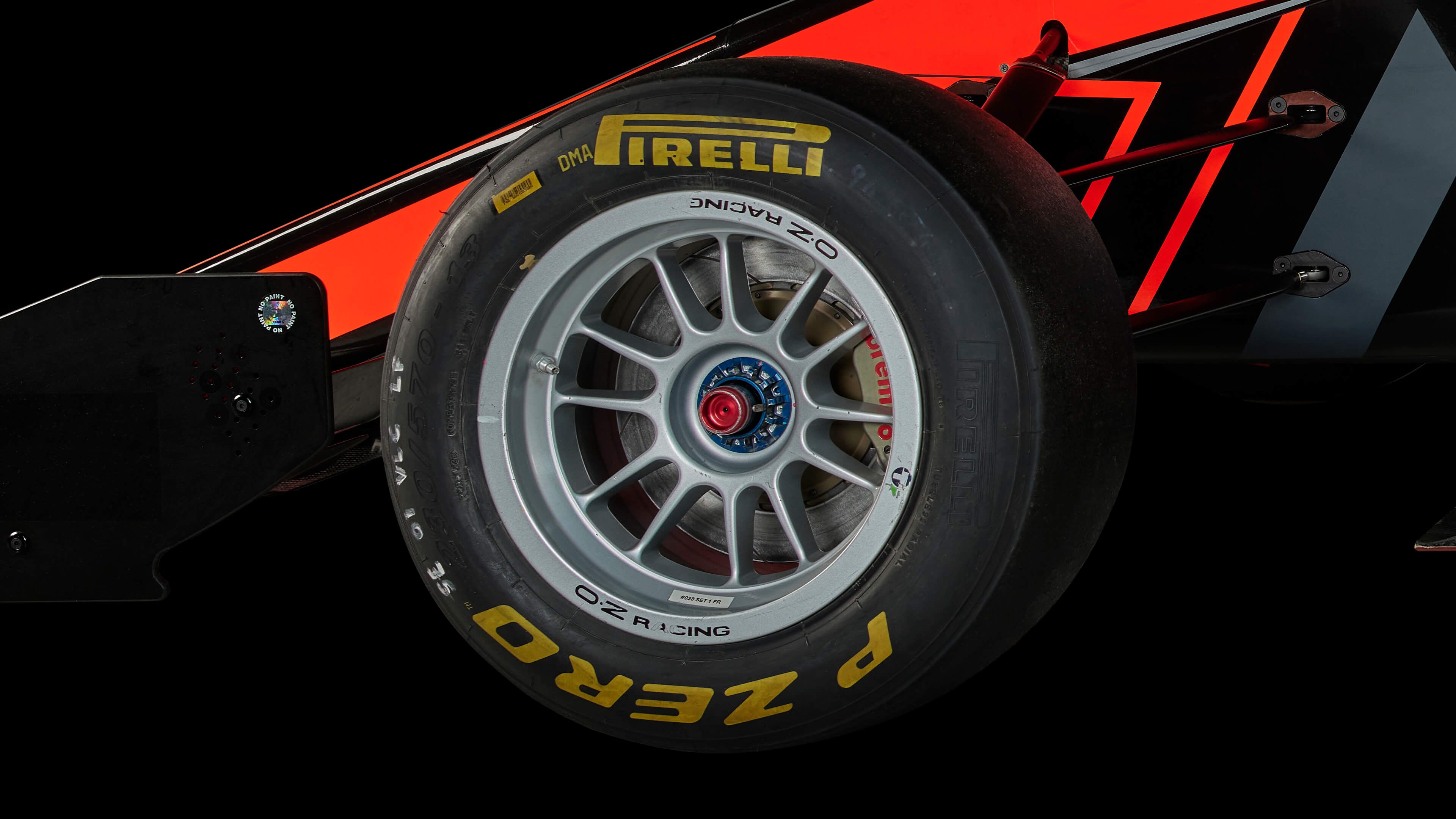 Vista laterale di una moderna auto da corsa di Formula 3 con sfondo nero. L'immagine è stata scattata da un'angolazione bassa ed è catturata in una qualità senza precedenti con fantastici dettagli degli spoiler e del cockpit.