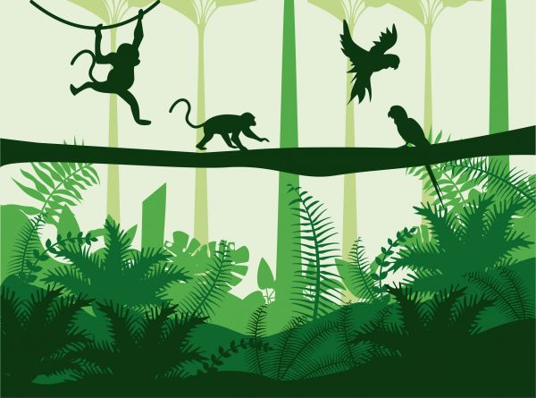 Un'illustrazione verde con scimmie che giocano nella gabbia delle scimmie.