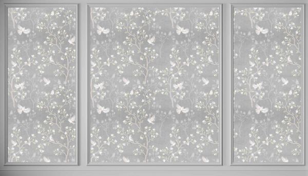 Una serena composizione di piante monocromatiche e morbide forme di uccelli adorna questi pannelli. I morbidi toni grigi suggeriscono la quiete dell'alba, come se ogni uccello e ogni foglia fossero immersi nella luce soffusa di un mattino nebbioso.